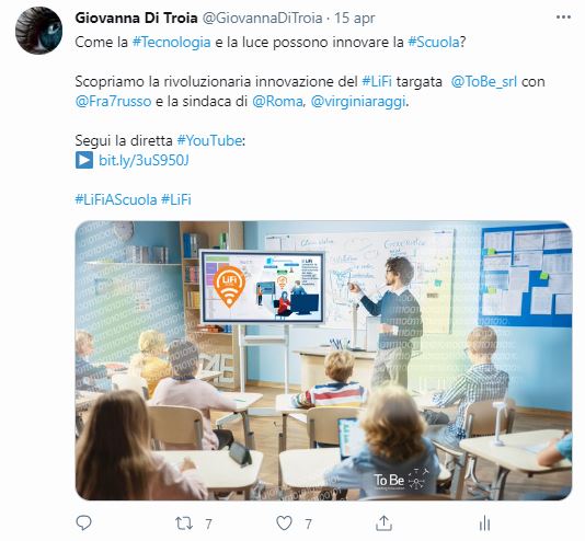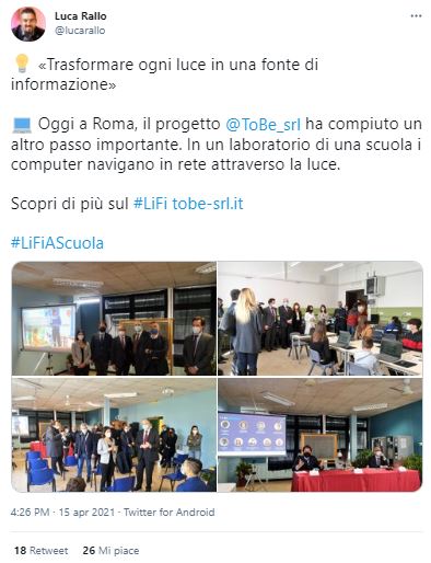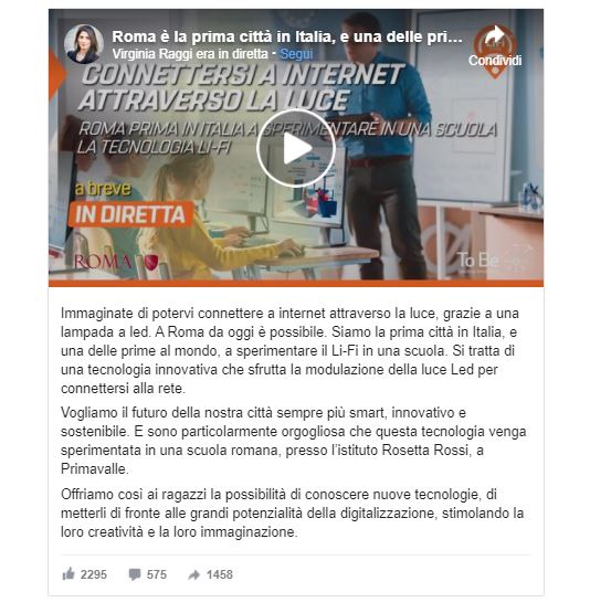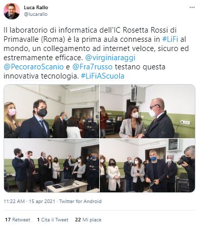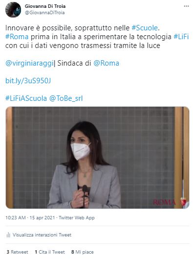 Giovedì 15 aprile si è tenuta in diretta streaming, la conferenza stampa di presentazione del progetto “Scuola Li-Fi”, presso l’Istituto Comprensivo Rosetta Rossi di Primavalle. Dopo i saluti introduttivi del Preside, è intervenuta Virginia Raggi, Sindaca di Roma che si mostra fiera che sia di Roma la scuola pioniera, tra le prime al mondo, ad accogliere questa tecnologia innovativa.