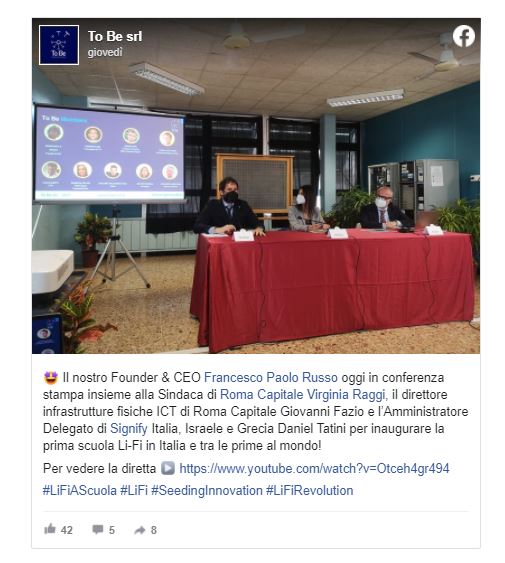 “Scuola Li-Fi” nasce dalla collaborazione tra Roma Capitale e la start up To Be srl, e con il coinvolgimento di partner industriali e strategici come Signify, azienda specializzata nel settore dell’illuminazione e TecnoElectric Srl.