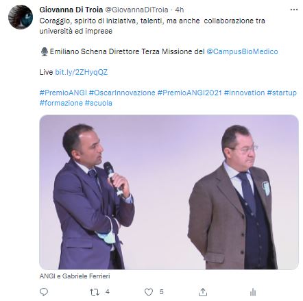 Innovazione, eccellenze, talenti, sostenibilità, inclusività, meritocrazia, formazione, collaborazione, possibilità di crescita e rilancio economico e sociale per l’Italia queste le tematiche su cui si è concentrata la cerimonia di Premiazione della quarta edizione del Premio ANGI, promosso dall’Associazione Nazionale Giovani Innovatori con l’alto patrocinio del Parlamento Europeo e della Commissione Europea.