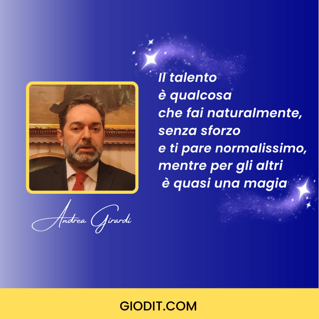 Il talento è qualcosa che hai dentro di te, spesso nemmeno lo sai, lo sottovaluti, tendi considerarlo una banalità, perché si esprime sempre con grande facilità. Insomma è qualcosa che fai naturalmente, senza sforzo e ti pare normalissimo mentre per gli altri è quasi una magia.